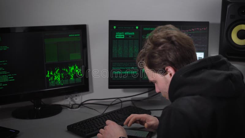 Computer Room In The Basement A Man Checks The Information On
