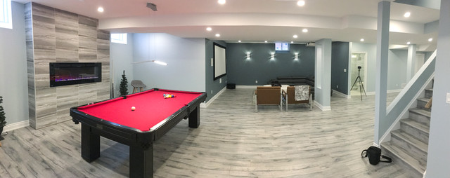 These cool finished basement ideas share a variety of exciting ways you can get the most out of your extra living space. Game room contemporary basement chicago this is an example of a contemporary fully buried basement in chicago with dark hardwood flooring no fireplace and brown floors. A finished basement design gives you family and friends a place to hang out and enjoy any time of year.