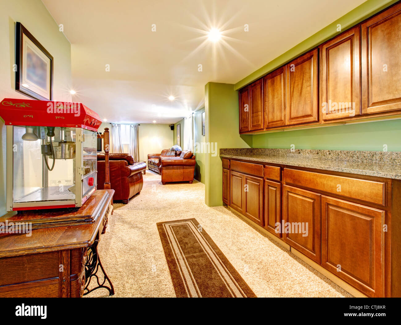 Basement Interior With Cabinets Green Walls And Popcorn Machine